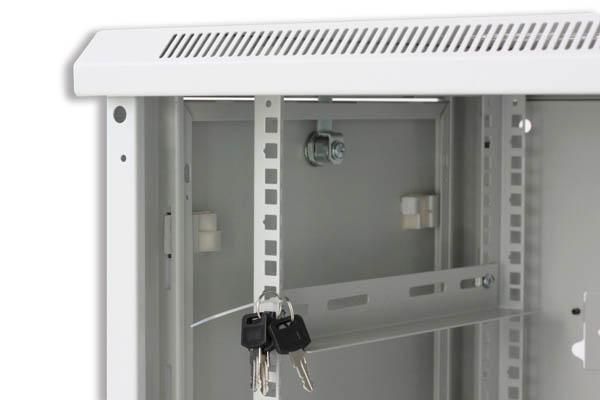 Armadio a muro a sezione unica 15 unità con pannelli laterali asportabiliPorta in vetro temprato da 5 mm, facilmente removibile e reversibile, apertura maggiore di 180°, chiusura con chiavePannello posteriore cieco asportabile dotato di apertura per passaggio cavi con pannellino (dimensioni 375 x 60 mm)Pannelli laterali ciechi provvisti di serratura a chiave asportabiliDue coppie di montanti 19 regolabili in profonditàColore: RAL 7035 (grigio)Dimensioni: 770x600x600 mm (AxLxP)* L immagine è indicativa e ha solo lo scopo di mettere in evidenza la struttura dell armadio; per colore e dimensioni fare riferimento alla scheda del prodotto