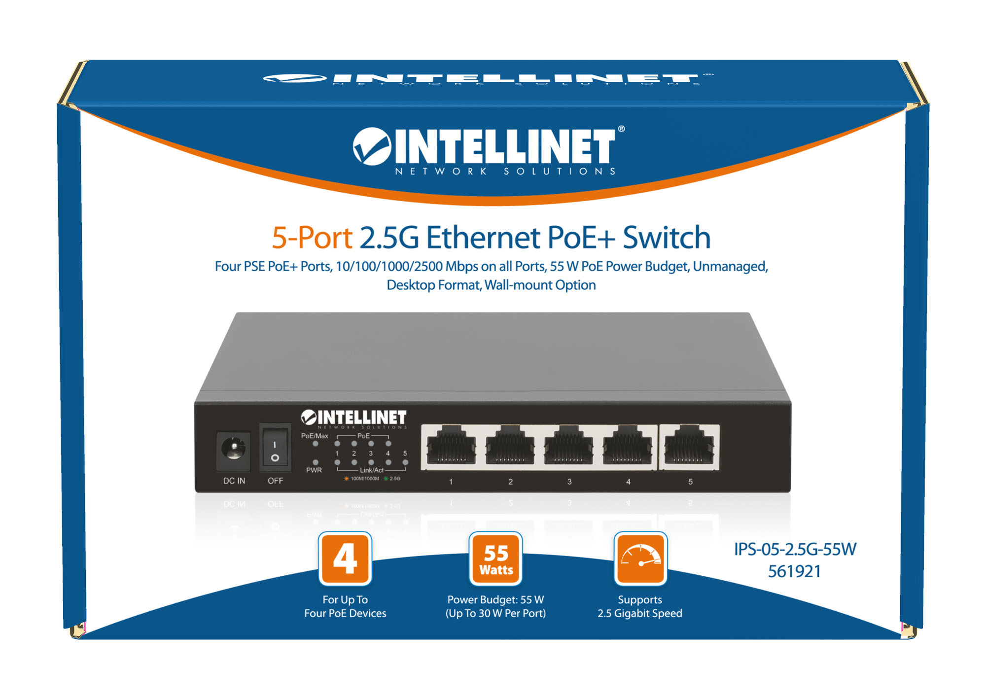Ethernet switch PoE+ 5 porte 2.5G Base-T ultra veloci, compatibili IEEE 802.3bzPorte Ethernet RJ45 2.5G BASE-T ultra veloci, compatibili IEEE 802.3bz; Budget di alimentazione di 55WPorte 10/100/1000/2500 Mbps auto-sensing che automaticamente rilevano la velocità di rete ottimaleSupporta dispositivi PoE compatibili con IEEE 802.3at e IEEE 802.3af (ad es. punti di accesso wireless, telefoni VoIP, telecamere IP); Supporta 16k MAC address con Auto-learning e Auto-aging; Buffer memory di 12 MBitsAlloggiamento in metallo; Dimensioni: 110 x 160 x 26 mm; Colore: nero