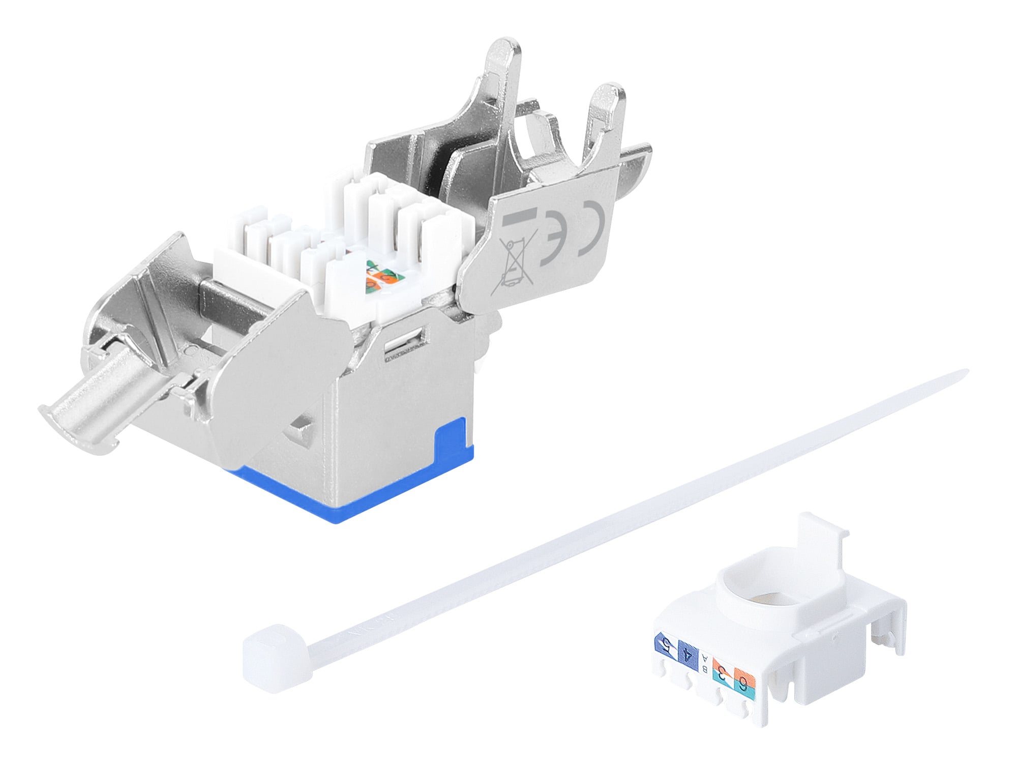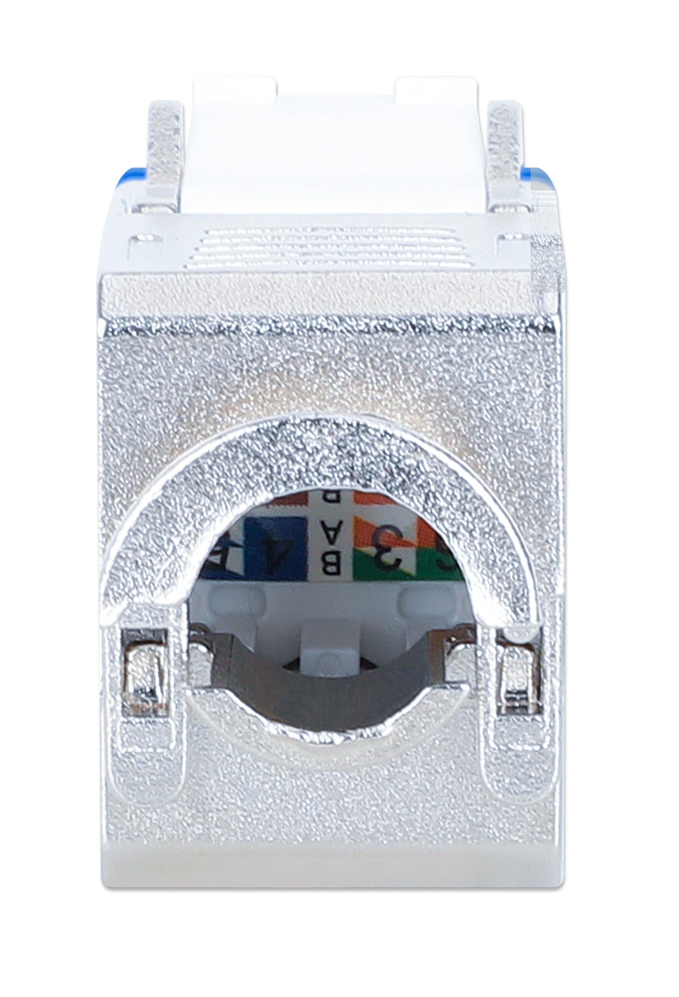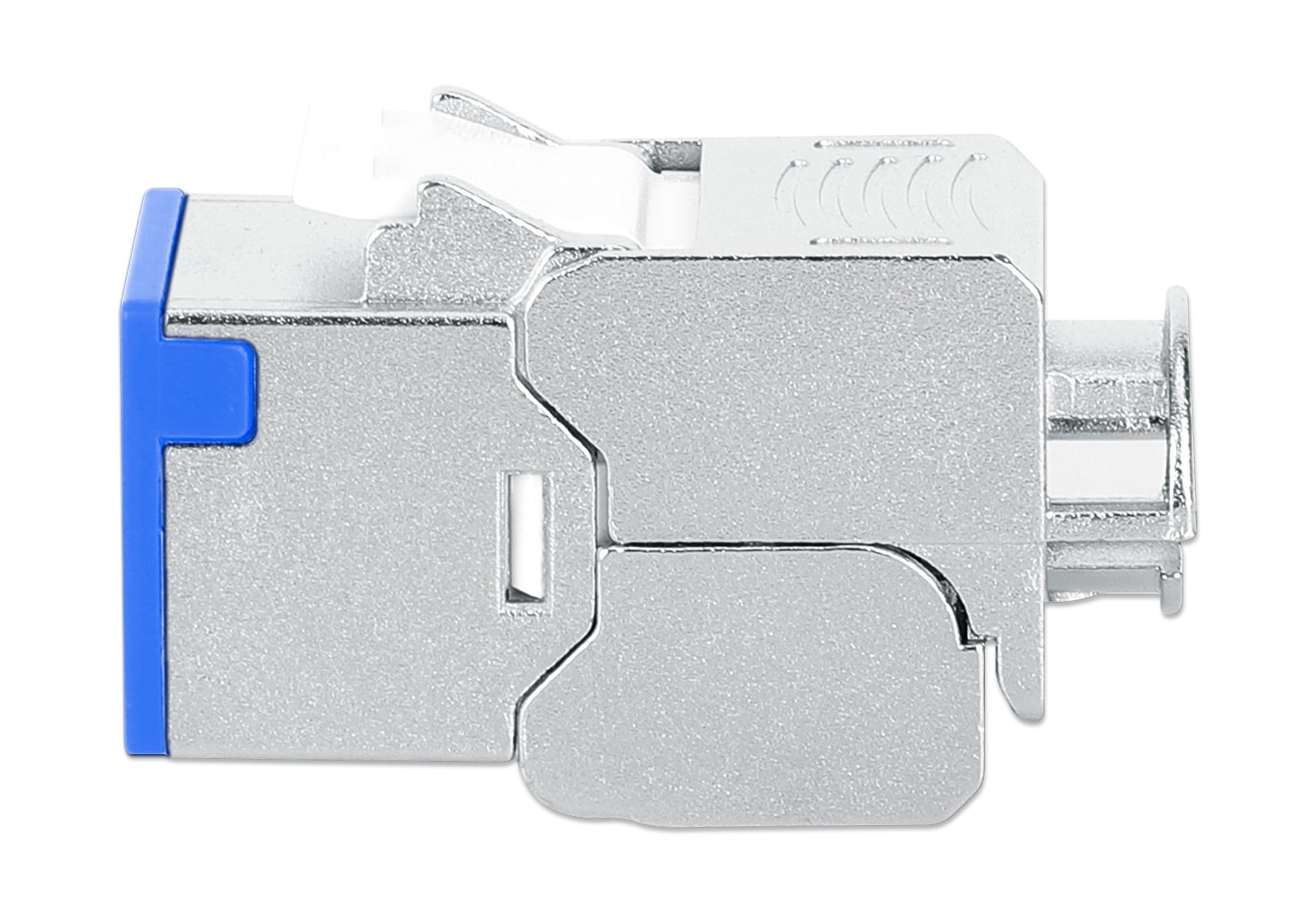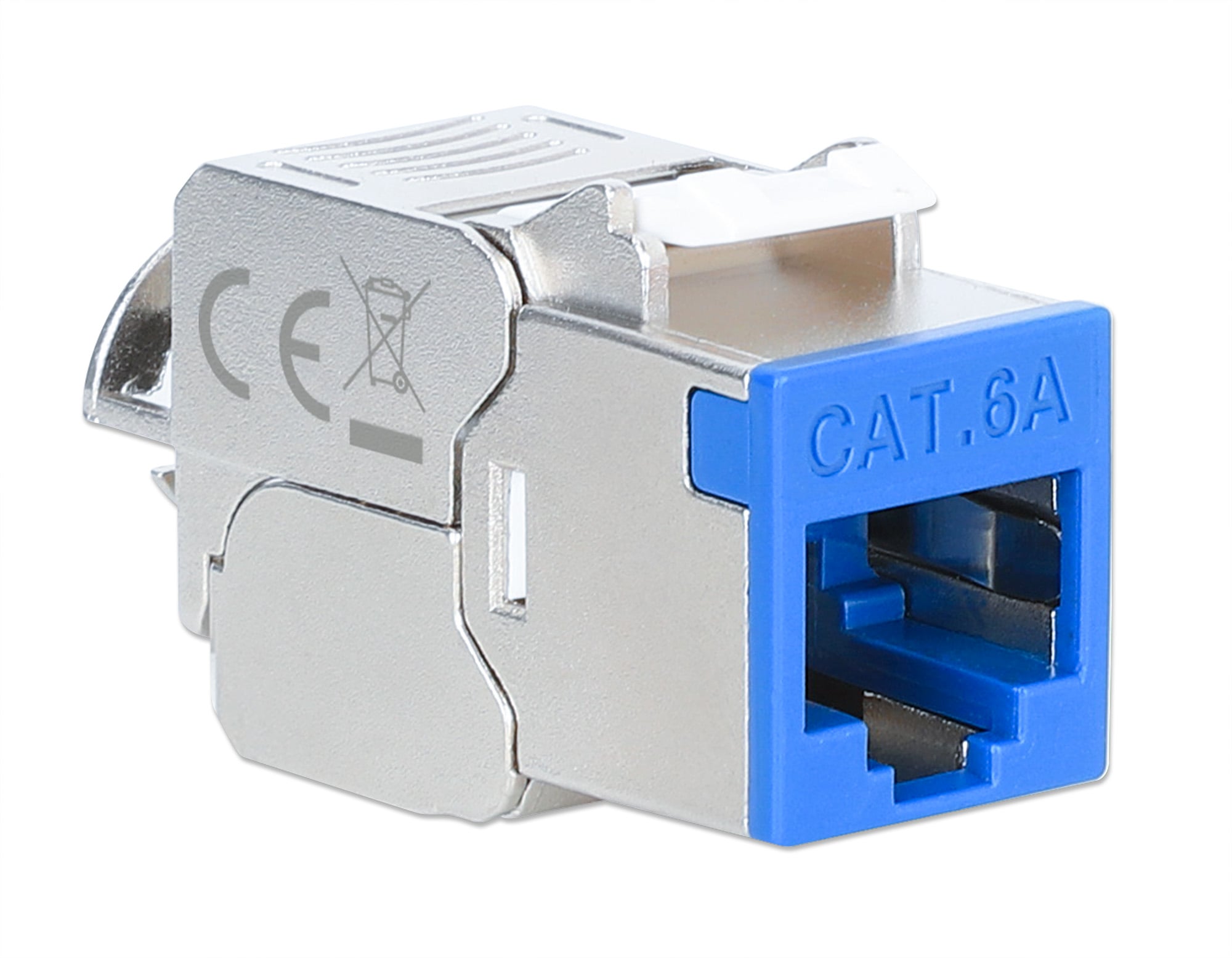 Frutto keystone RJ45 Cat.6A Class EA struttura slimPer l uso veloce e senza attrezzi in pannello patch vuoti, placche a muro o scatole di connessioneDesign compatto, solo 1,4 mm di larghezza per comode installazioni affiancateModulo RJ45 STP schermatura a 360° per applicazioni PoE fino a IEEE802.3bt / PoE++ / 4PPoE / Ultra PoE; Contatti placati oro 6 micro polliciDimensioni: 36 x 14,8 x 20 mm; Colore: silver / blu