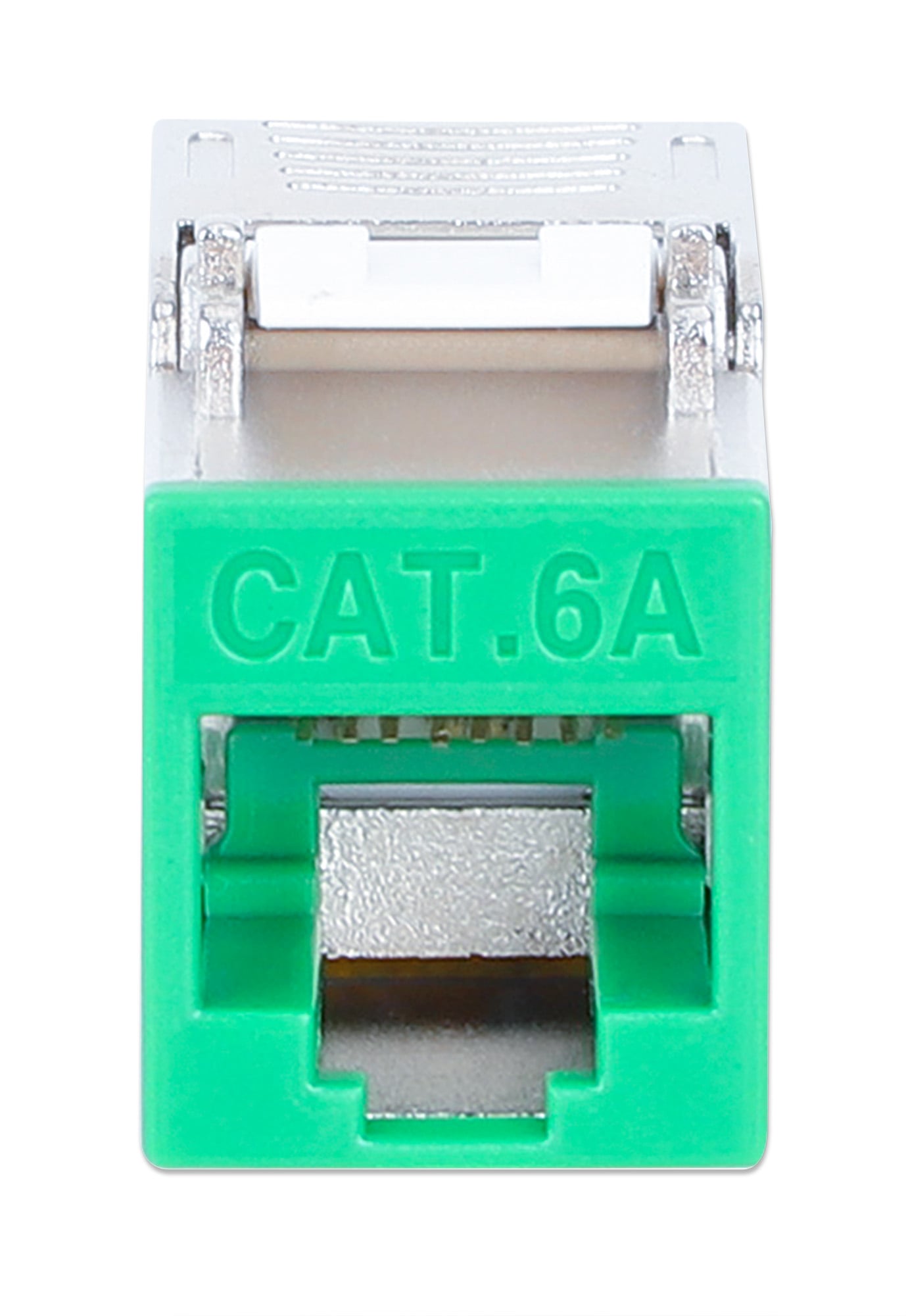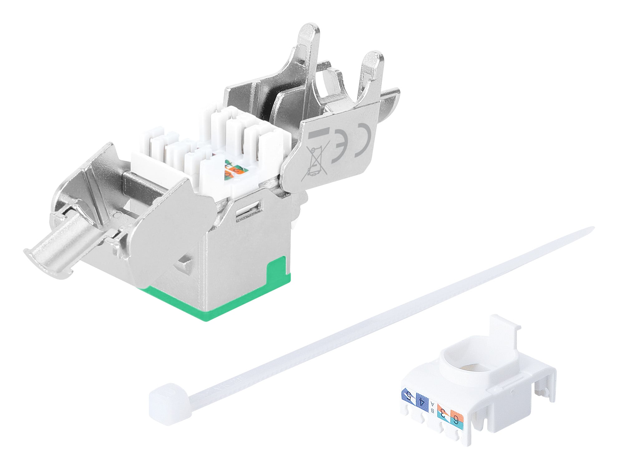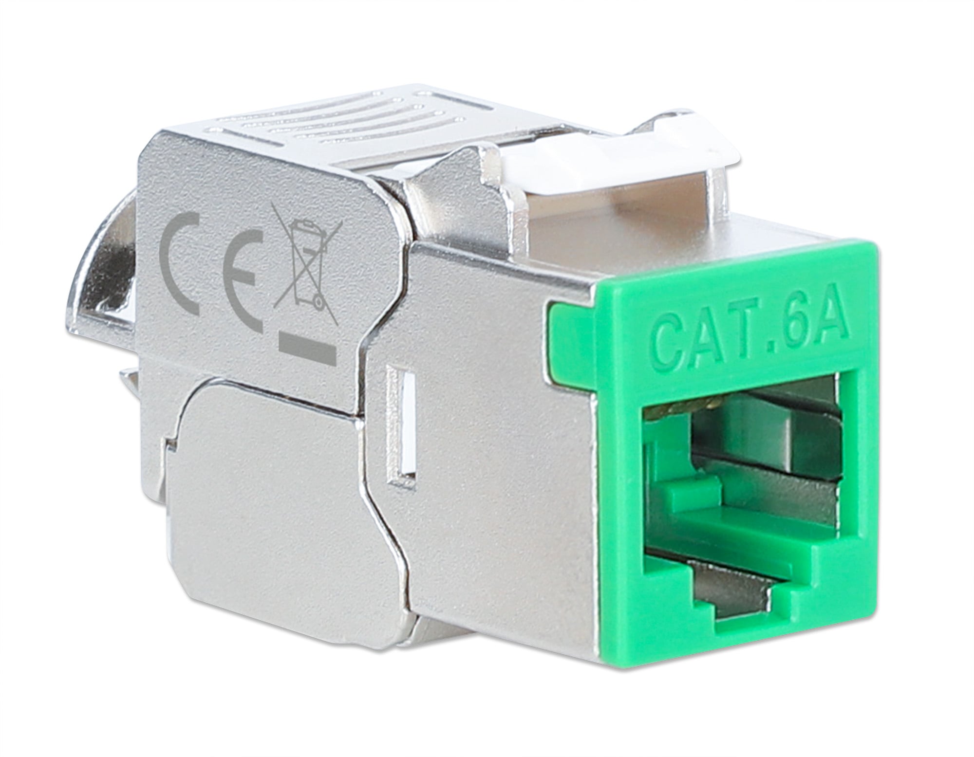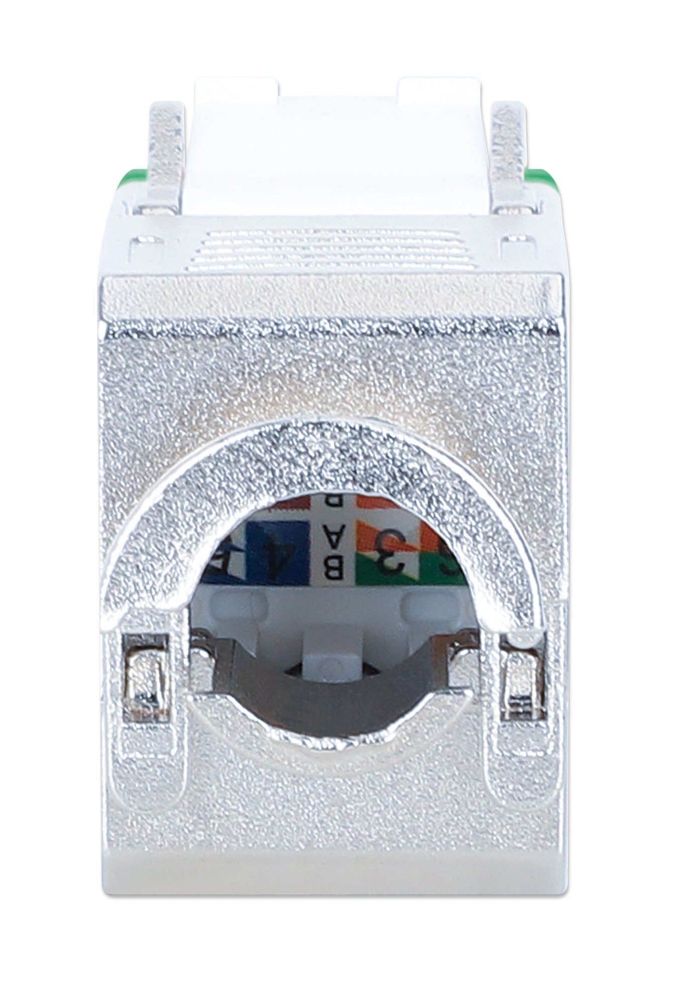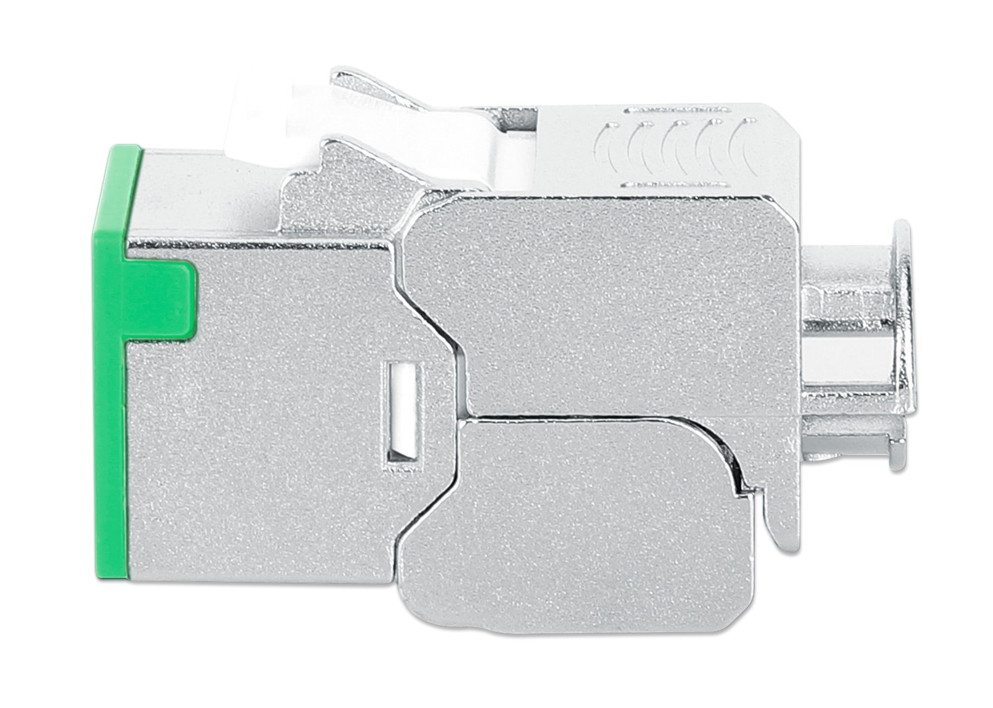 Frutto keystone RJ45 Cat.6A Class EA struttura slimPer l uso veloce e senza attrezzi in pannello patch vuoti, placche a muro o scatole di connessioneDesign compatto, solo 1,4 mm di larghezza per comode installazioni affiancateModulo RJ45 STP schermatura a 360° per applicazioni PoE fino a IEEE802.3bt / PoE++ / 4PPoE / Ultra PoE; Contatti placati oro 6 micro polliciDimensioni: 36 x 14,8 x 20 mm; Colore: silver / verde