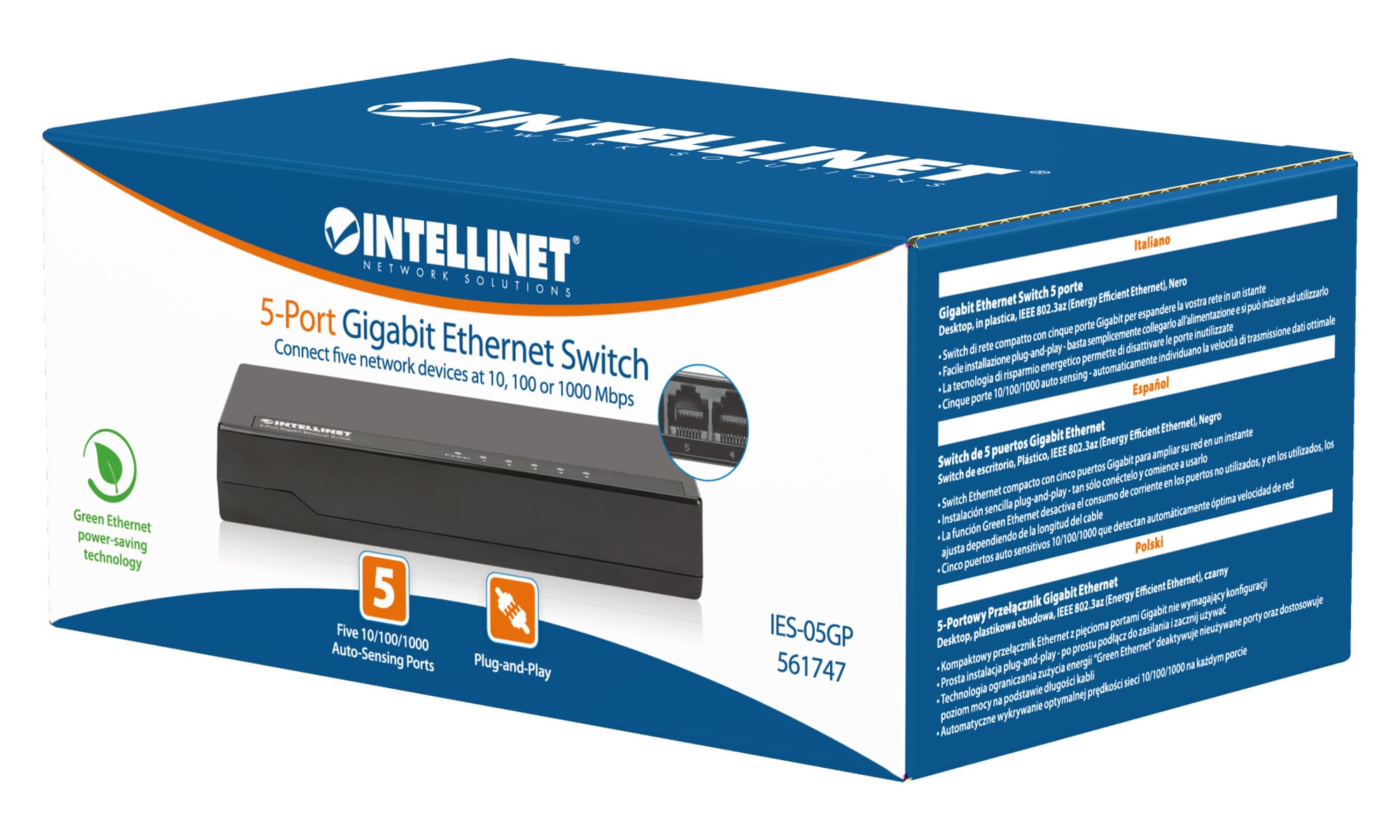 Switch di rete compatto con cinque porte Gigabit per espandere la vostra rete in un istanteFacile installazione plug-and-play - basta semplicemente collegarlo all alimentazione e si può iniziare ad utilizzarloLa tecnologia di risparmio energetico permette di disattivare le porte inutilizzateCinque porte 10/100/1000 auto sensing - automaticamente individuano la velocità di trasmissione dati ottimaleSupporta periferiche con qualsiasi combinazione di trasferimento dati a 10 Mbps o 100 Mbps o 1 GbpsDimensioni (P x L x A): 81 x 48 x 22 mm; Colore: nero