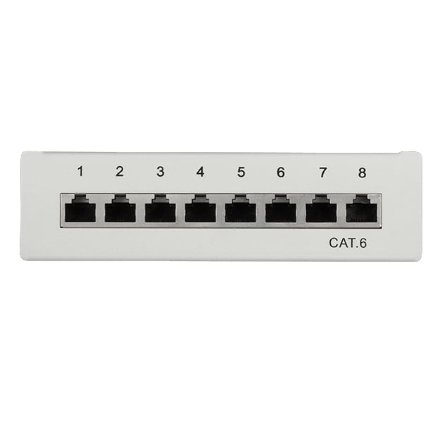 Pannello patch desktop 8 porte STP (schermato)Compatibile EIA/TIA 568 B, ISO 11801, EN 50173, TSB 40Compatibile con inseritori LSAInstallabile a muroColore RAL7035 GrigioDimensioni: (L x P x H) 160,3 x 108 x 44,2 mmCategoria 6