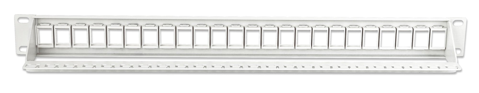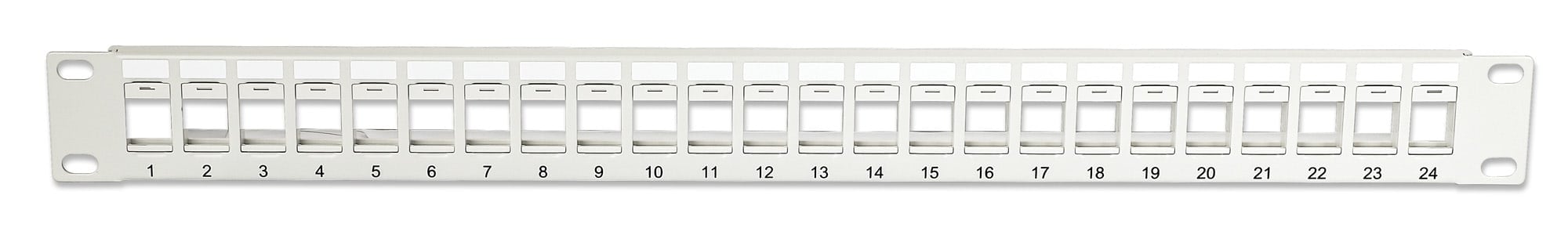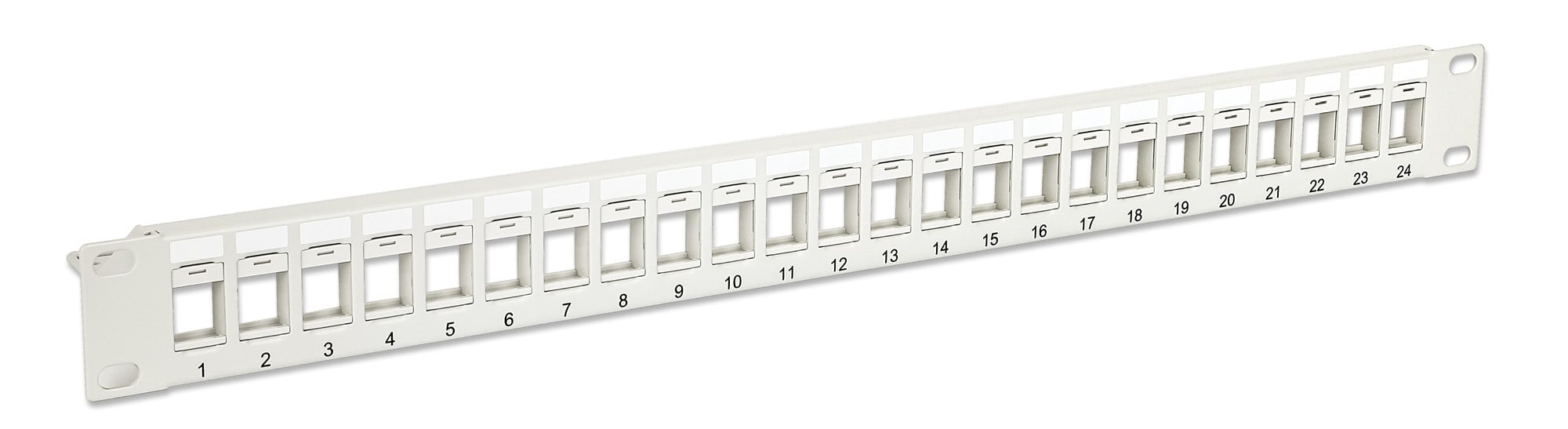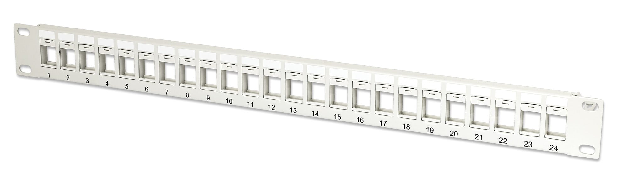 Pannello patch panel modulare senza frutti 24 posti per il montaggio con moduli KeystoneInstallabile a rack 19 con porte pre-numerate; Occupa una unità 1UDisegnato per rack e cabinet con standard 19Spessore lamiera: 1,5 mm, verniciatura di colore grigioDimensioni: 92.7 (P) x 482.6 (L) x 43.6 (A) [mm]