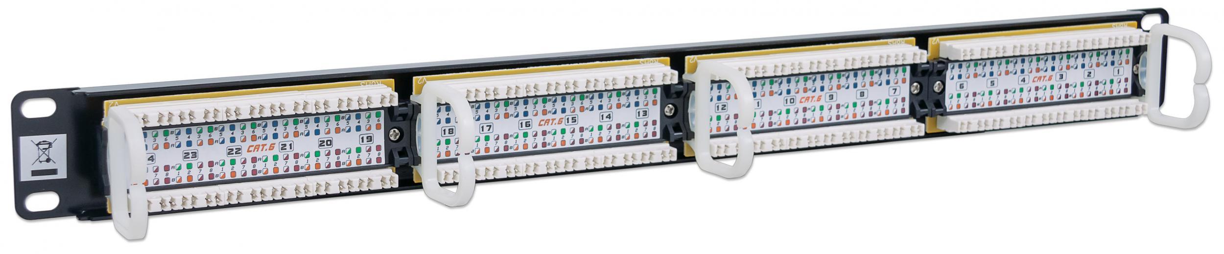 Pannello patch UTP 24 posti RJ45 cat. 6Terminazioni solide e resistenti per cablaggi in rame caratterizzati da connettori con contatti dorati da un minimo di 3 mm 50 micro-polliciCompatibile sia con inseritori 110 che KroneSupporta cavo rigido e flessibile da 22 a 26 AWGDa utilizzare con cavo di rete non schermato a coppie ritorte (UTP) Cat6Le prestazioni della Cat6 sono conformi agli standard ANSI/TIA/EIA 568 B.2-1Ideale per applicazioni di rete Ethernet, Fast Ethernet e Gigabit EthernetCollega le porte RJ-45 alla reteConforme agli standard 19 per montaggio a rack