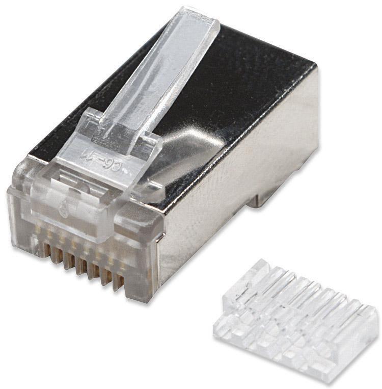 Plug Cat.6 RJ45 per cavo STP (slitta + plug)Installabile su cavo tondo flessibile Contatti dorati 15 µLamella a 2 contatti per cavo flessibilePer applicazioni su cavo a coppie schermato Prezzo singolo. Acquistabile in multipli di 10 pezzi