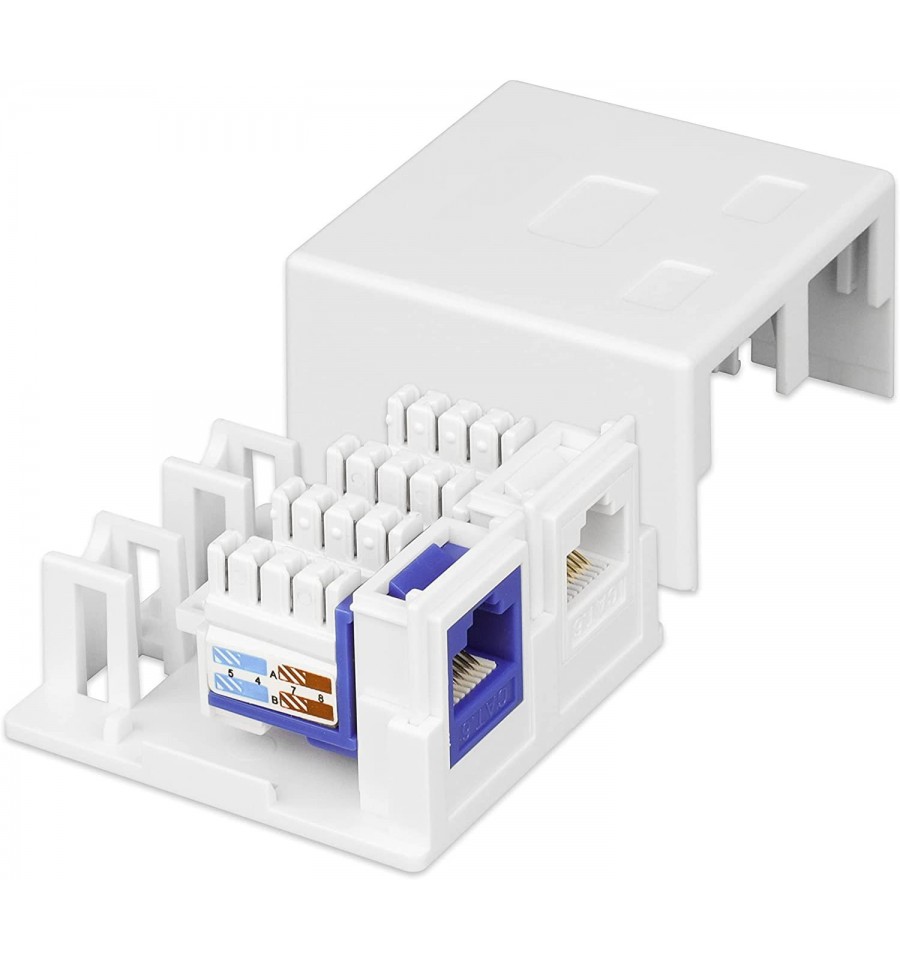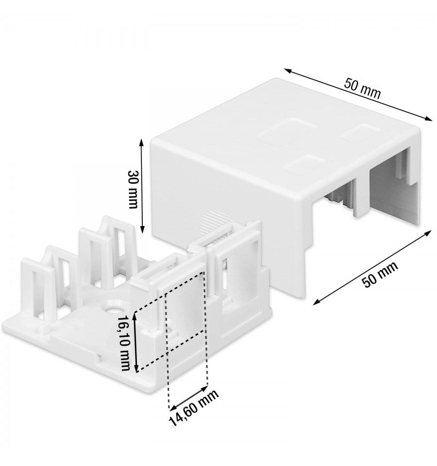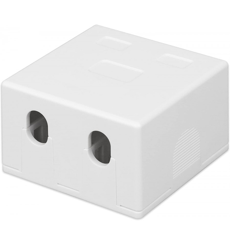 Presa a muro per due frutti keystone (frutti non inclusi)Supporta frutti Keystone di rete RJ45 o telefonici RJ11/12Include viti di fissaggio e biadesivoDimensioni: 50 x 30 x 50 mmMateriale: plastica; Colore: bianco