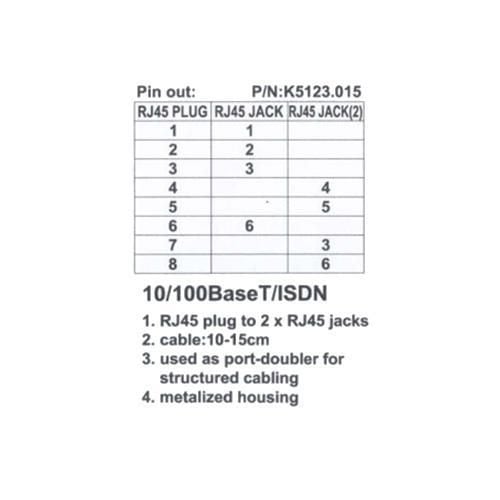 Sdoppiatore rete / telefonoAdattatore a T per cavo Cat.5e1 x 10/100BaseT , 1 x ISDN per cable-sharing1 x plug RJ45 a 2 jack x RJ45Serve come un duplicatore di porta per il cablaggio strutturato, permette di sdoppiare un cavo di rete Cat.5 e condividere due porte RJ45Lunghezza: 15 cm