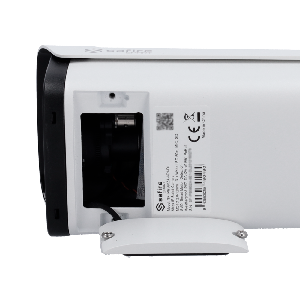 Safire SmartTelecamera Bullet IP gamma E1 Intelligenza ArtificialeRisoluzione 6 Megapixel (3200×1800)Ottica Motorizzata 2.8-12 mm | Audio IN | DL 50mIA: Classificazione di persone e veicoliWaterproof IP67 | PoE (IEEE802.3af)