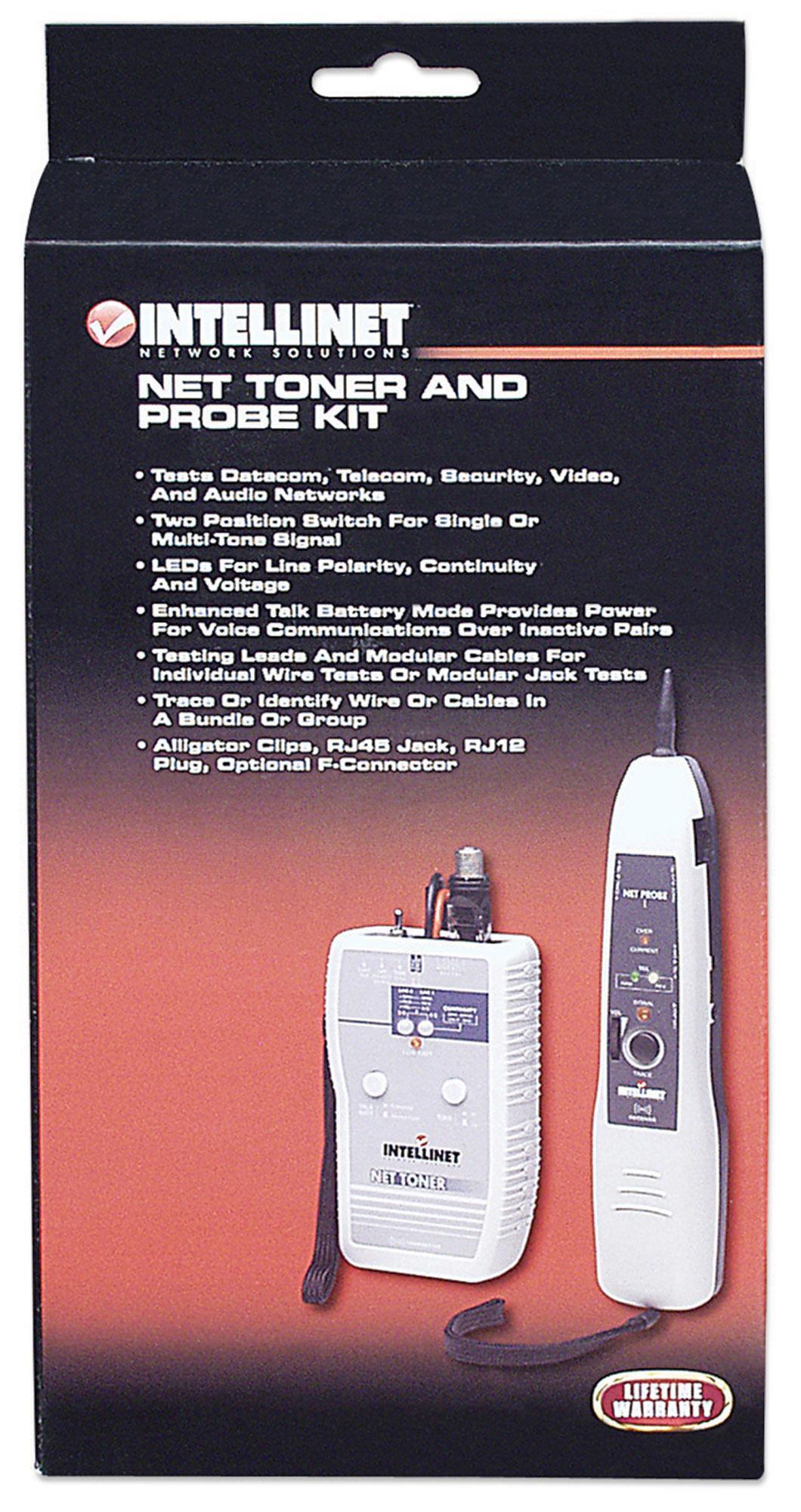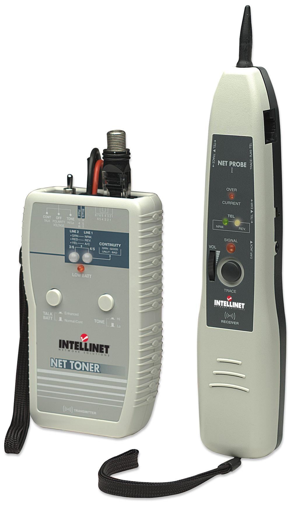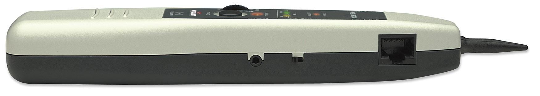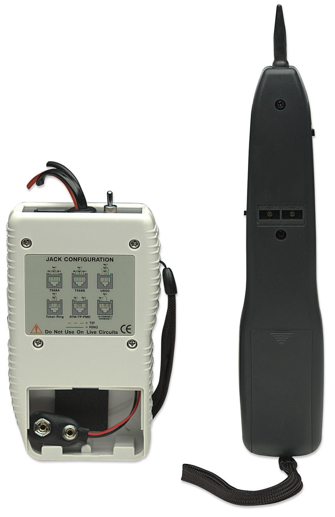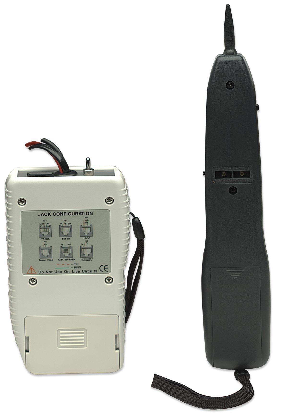 Generatore con sonda elettricaTesta comunicazioni dati, telecomunicazioni, reti audio e videoInterruttore a due posizioni per segnale singolo o multitonoLED per polarità, continuità e voltaggioMorsetti a coccodrillo, connettore RJ45, RJ12, opzionali tipo FFrequenza: High alternating 500-781Hz; Low 446-657HzBatteria: 9V DC standard o alcalinaDimensioni generatore: 125 x 68 x 26 mmDimensioni sonda: 210 x 40 x 28 mm