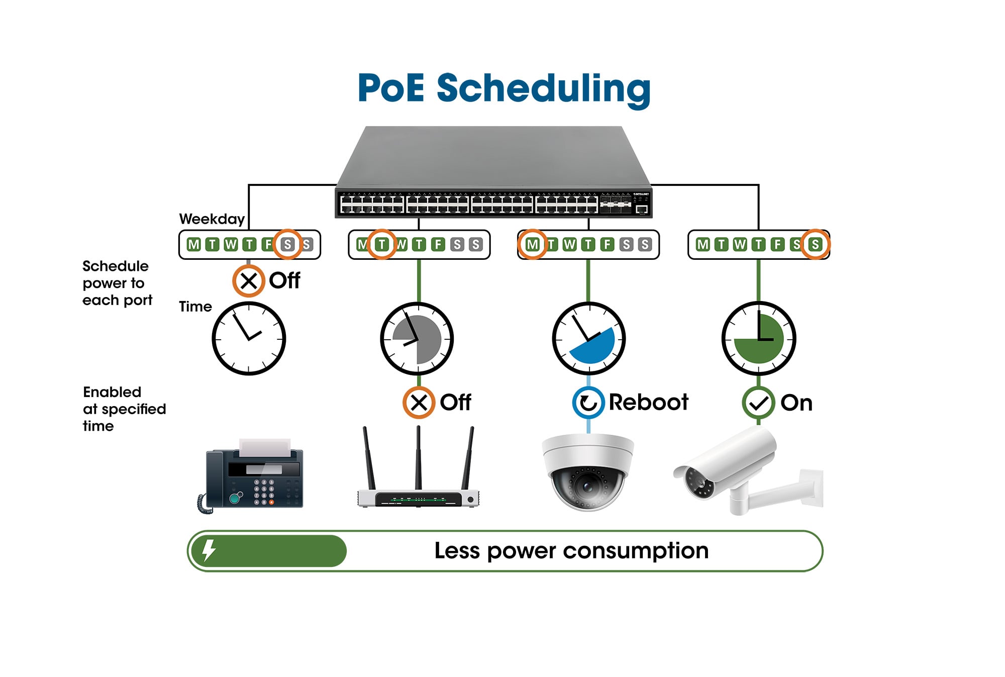 - Self-Healing Network: la funzione Powered Device Monitor (PDM) riavvia qualsiasi dispositivo PoE connesso che non risponde o non invia traffico di rete