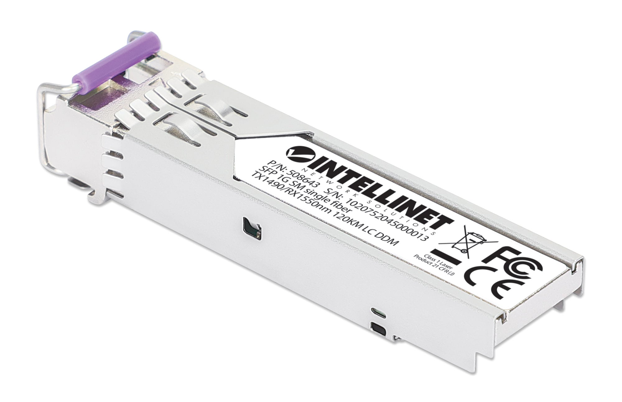 - Deve essere utilizzato con il modulo ricetrasmettitore ottico SFP bidirezionale WDM in fibra Gigabit, modello Intellinet 508650 o modello Cisco GLC-BX120-D