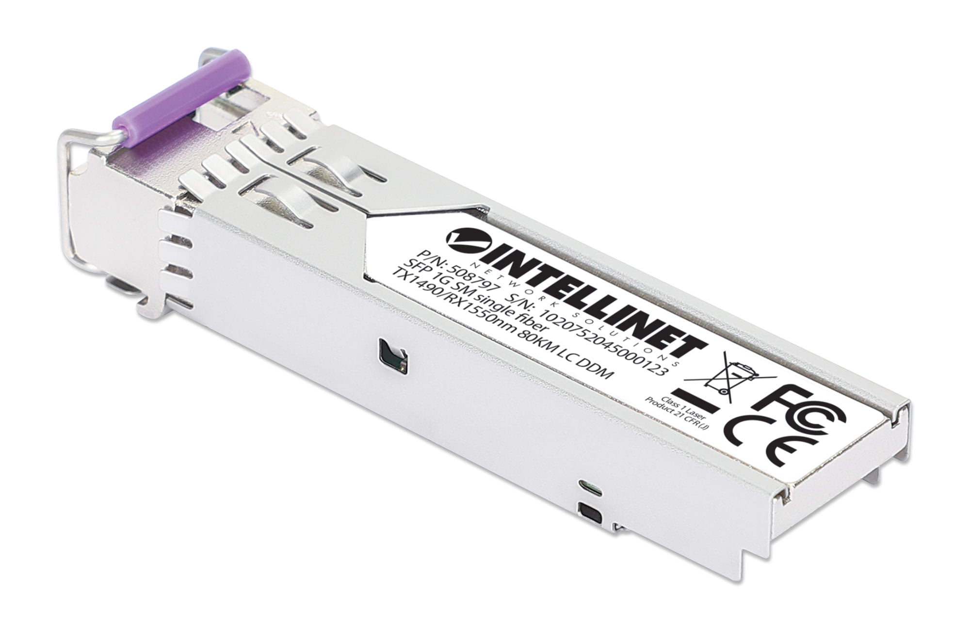 - Deve essere utilizzato con il modulo ricetrasmettitore ottico SFP bidirezionale WDM in fibra Gigabit, modello Intellinet 508629 o modello Cisco GLC-BX80-DA